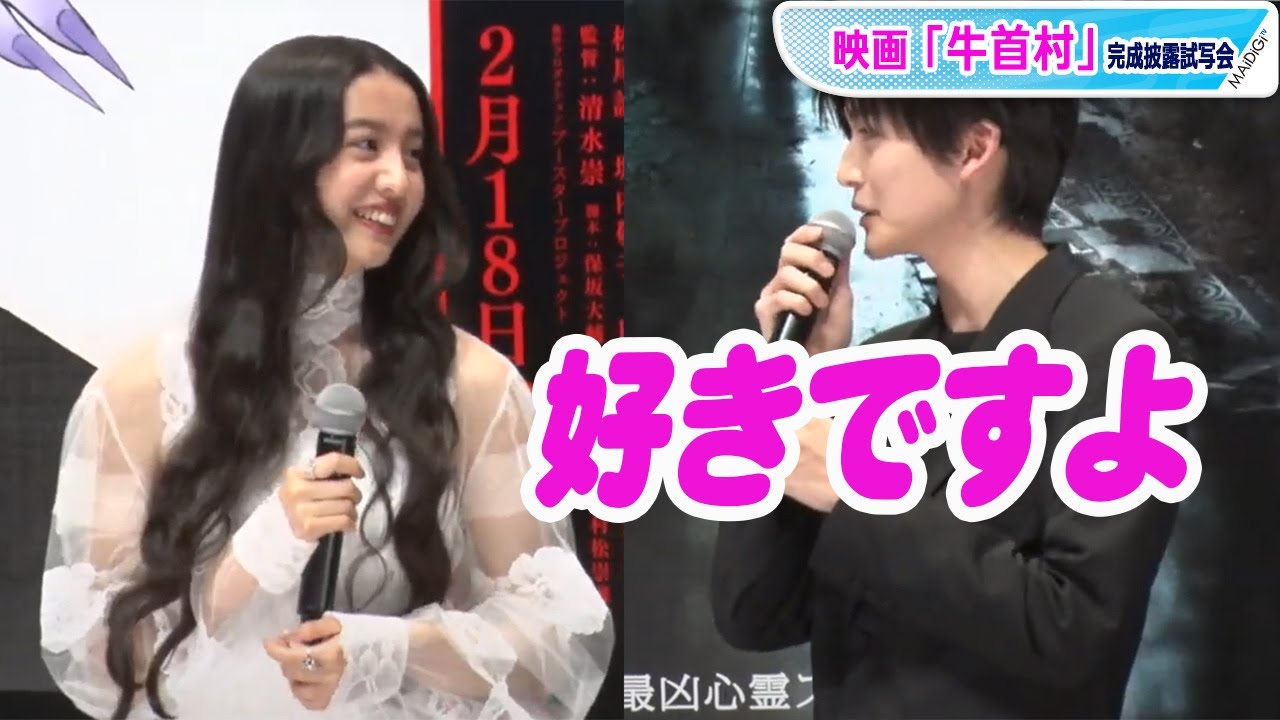 俳優の高橋文哉さんが1月19日、東京都内で行われた、映画「牛首村(うしくびむら)」(清水崇監督、2月18日公開)の完成披露試写会に、主演のKoki,(コウキ)さんらと登場した。Koki,さんが演じる詩音(しおん)の恋人・将太を演じた高橋さんは、共演の感想を聞かれると「将太を演じながら、僕が気持ちを持っていかれるぐらい、Koki,ちゃんのお芝居にのめり込んで一緒にシーンを作ることができました」と手応えを語った。